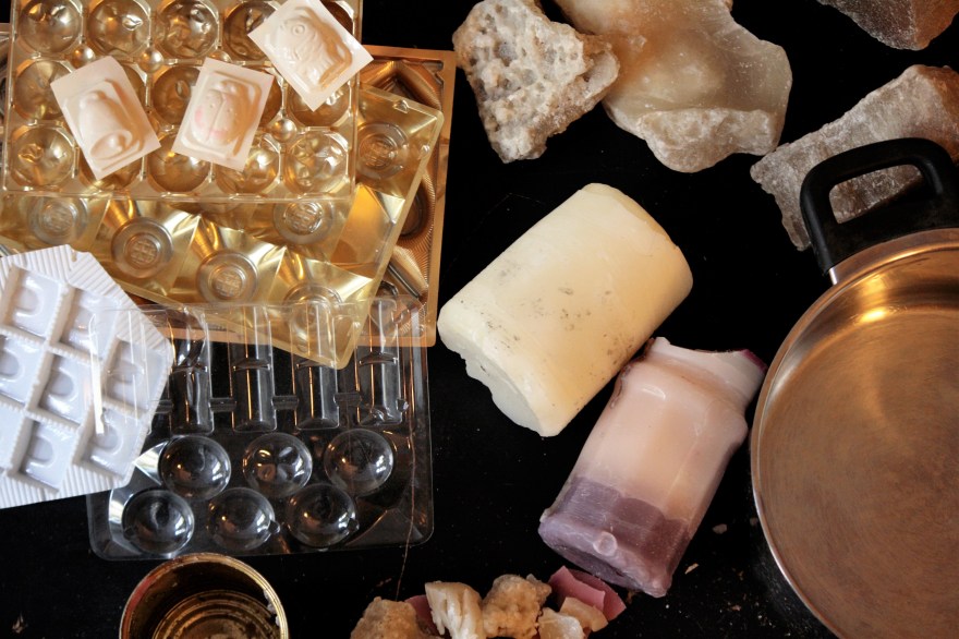 Das Wachs stammt einerseits von Kerzenresten. Das im Hintergrund ist Paraffin, welches wir aus unserem Sommerurlaub in Dänemark mitgebracht haben. (Dort lag es am Strand und wir rätselten zunächst, worum es sich bei diesen seltsamen Brocken handelt. Wie wir herausfanden, landete es dort nicht auf natürlichem Weg, sondern dadurch, dass die Tanker ihre Tanks auf offenem Meer reinigen dürfen und somit die Reste des Erdölprodukts ins Meer geleitet werden. Weitere Informationen zu der geduldeten Meeresverunreinigung findet Ihr hier oder auch hier.)