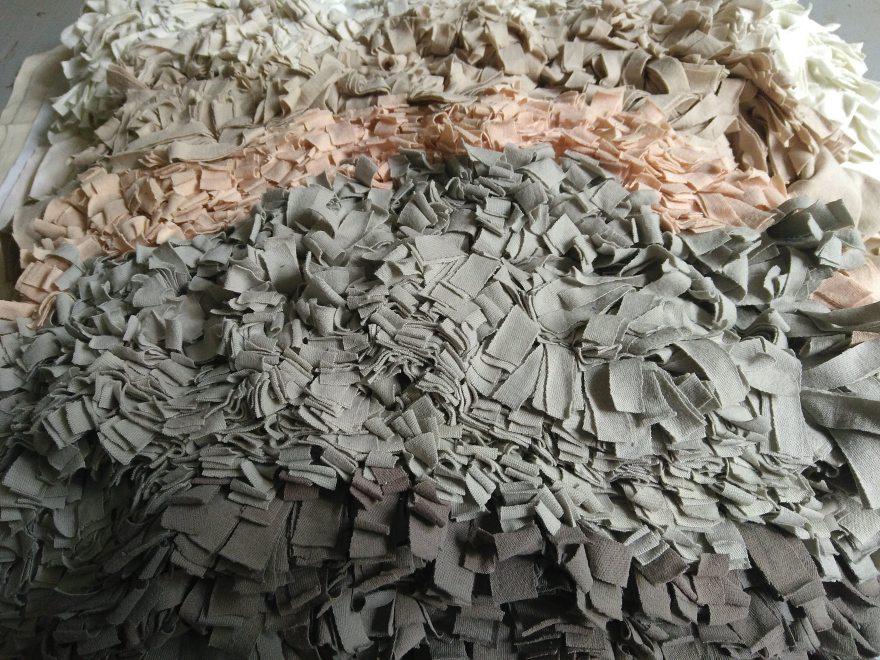 Was ihr hier seht ist das Ergebnis vieler Stunden Arbeit: wiederverwertete Jerseystoffe in lange Fransenbahnen geschnitten. Per Hand, nicht mit einer Maschine.