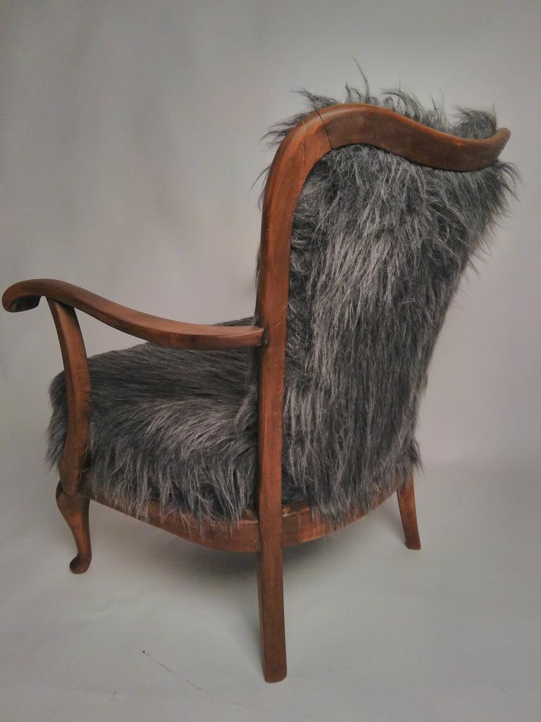 BANTHA : restored and newly upholstered wooden armchair with a cozy fake fur cover.