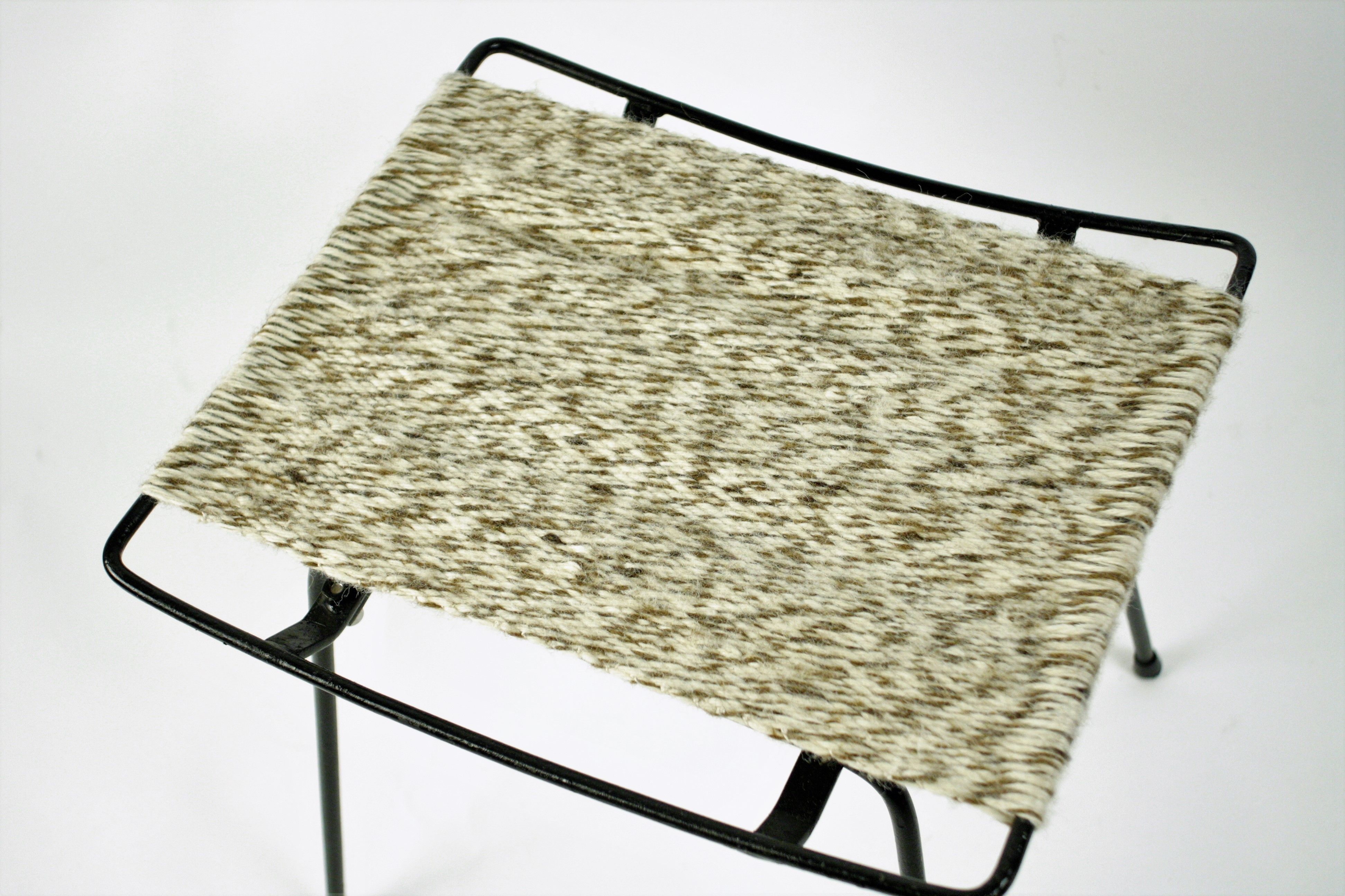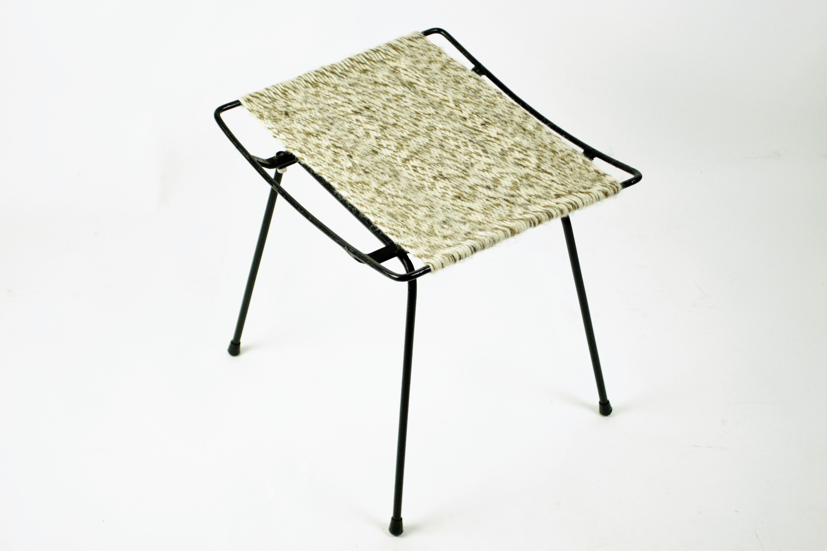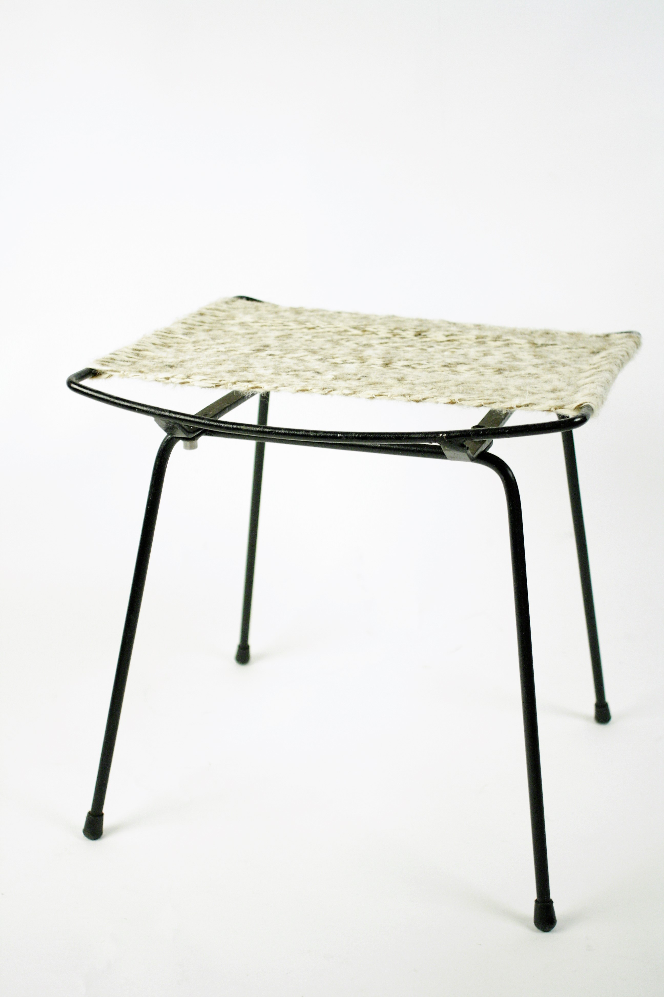 Dieser filigrane Hocker – benannt nach Athenes Beiname als die Beschützerin des Handwerks – hervorgegangen aus dem schlanken Stahlgestell eines ehemaligen Stuhles, besticht durch seine handgewebte Sitzfläche.