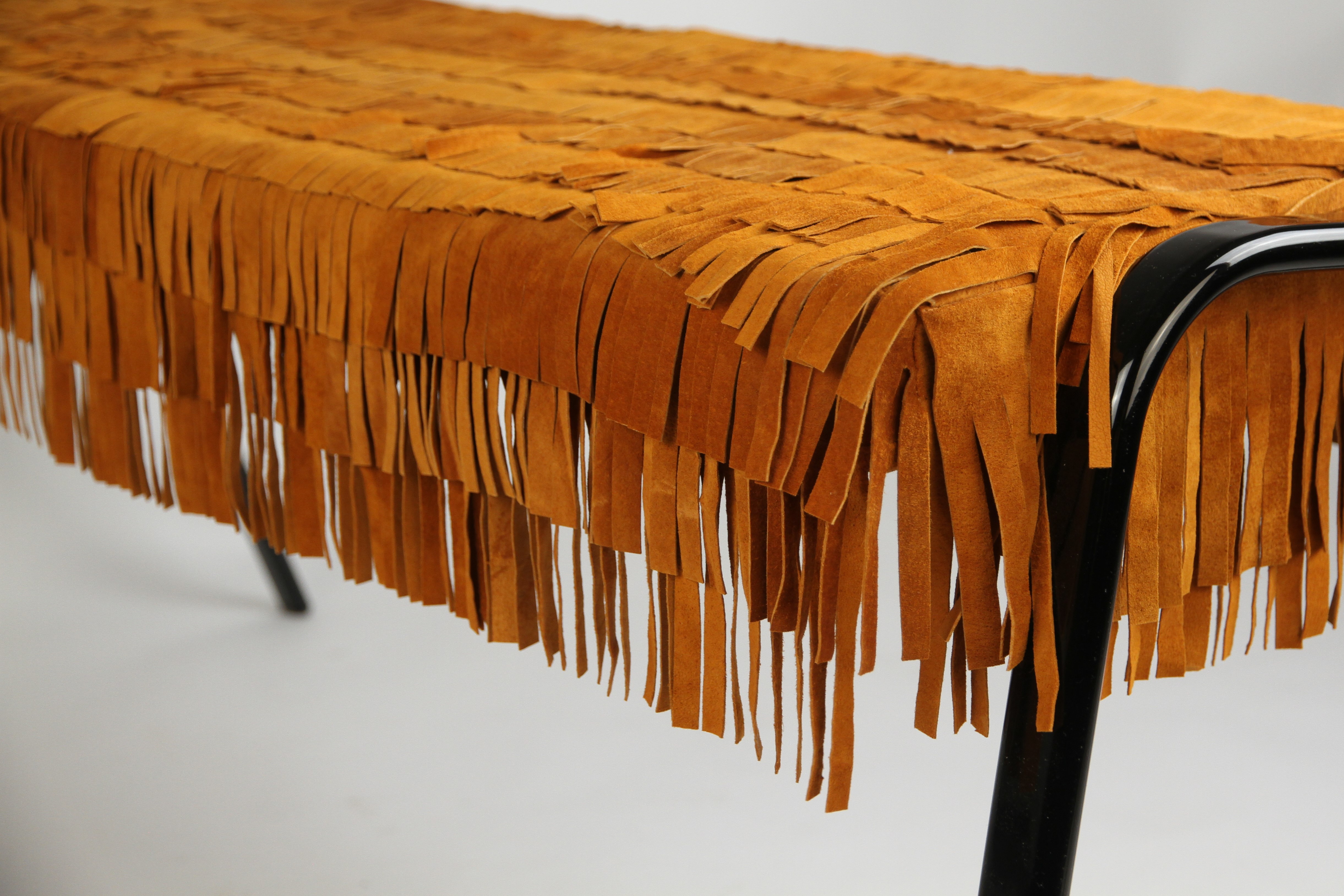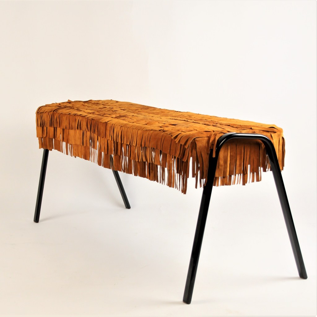 The black lacquered metal legs, originally from a discarded chair, emphasize the special coloring of the fringes of antique leather, which were elaborately cut individually by hand. The slightly changing shimmer of the suede, depending on the incidence of light, gives the seat a special charm. (Color shade may vary from the original depending on the screen).